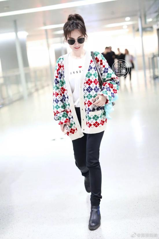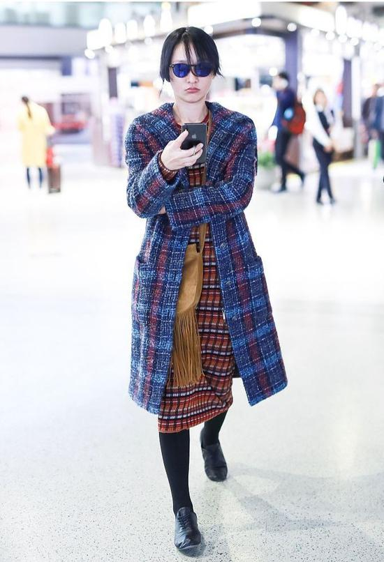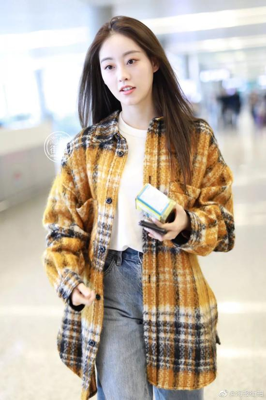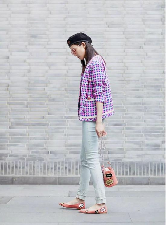 如果说Lisa那件是经典复古,那么张均甯这样的糖果色格纹外套可以说是少女感十足,再搭配同样可爱的鞋子和包包,可可爱爱的一套穿搭。