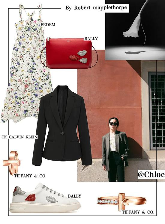 选择黑色西装外套,可以轻松应对初夏的温度变化(如果美术馆冷气太足的话~),再加上Tiffany新出的T1系列戒指,两个叠戴看起来更时髦,又平衡了一丝连衣裙的柔美,整体给人娘man娘man的感觉。小白鞋与红色的挎包则在细节上有所呼应。
