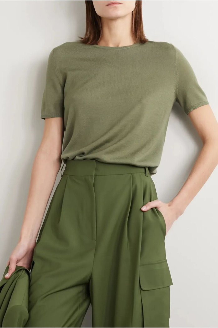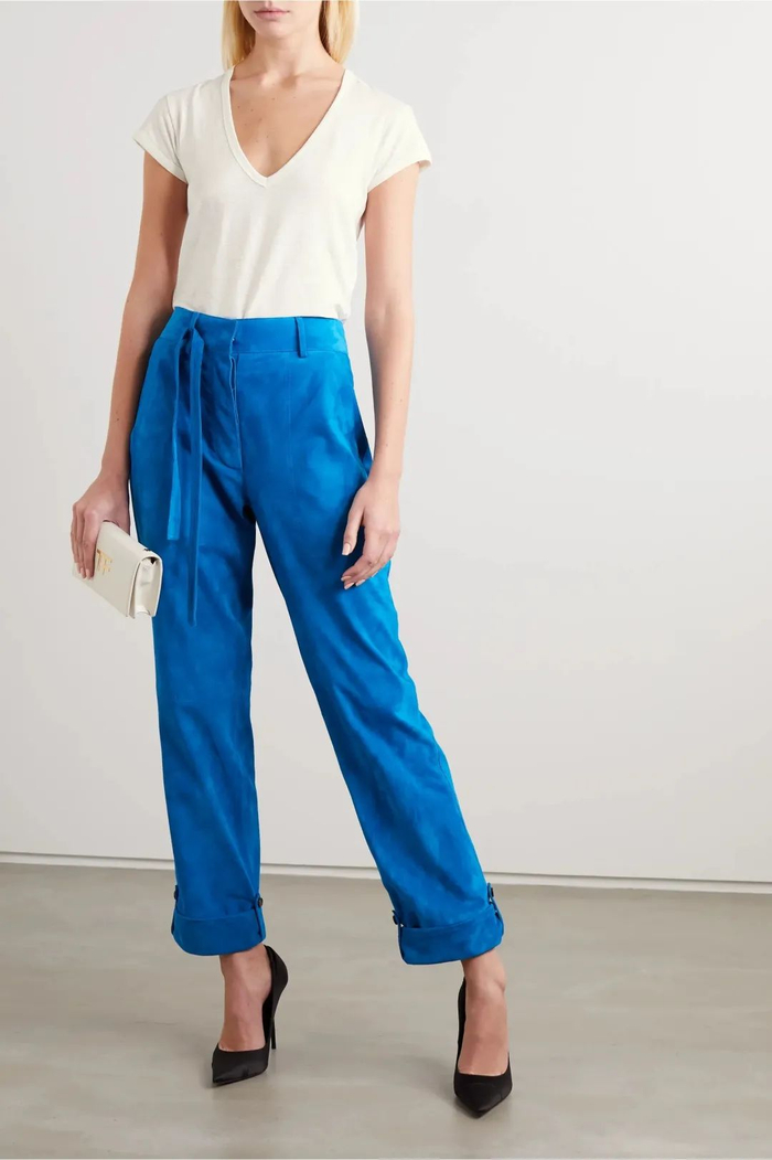 如果上衣面料顺滑有光泽,即使是圆领设计也很庄重感,搭配质感上乘的腰带,提升身材比例。