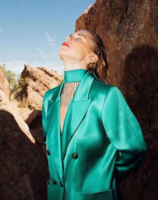 鼠尾草绿的饱和度和明度都非常低,更像是灰绿色,知性低调,非常适合用来演绎大女人风穿搭。