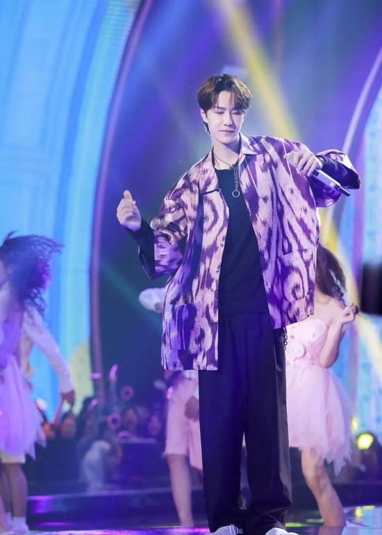 作为潮酷boy的王一博将oversize的紫色豹纹衬衫穿出了满满的嘻哈街头风,紫色一下子打破了全黑的沉闷造型,让人眼前一亮。