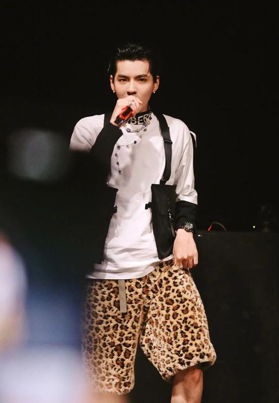 吴亦凡大胆地将豹纹短裤与长袖T恤及黑色工装马甲进行了混搭,打破了常规单调的工装风格,尽显凌厉、桀骜不驯的独特气质。