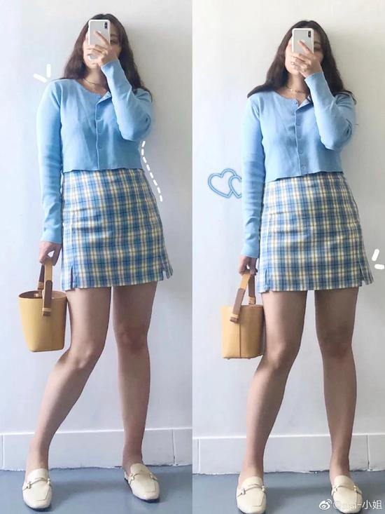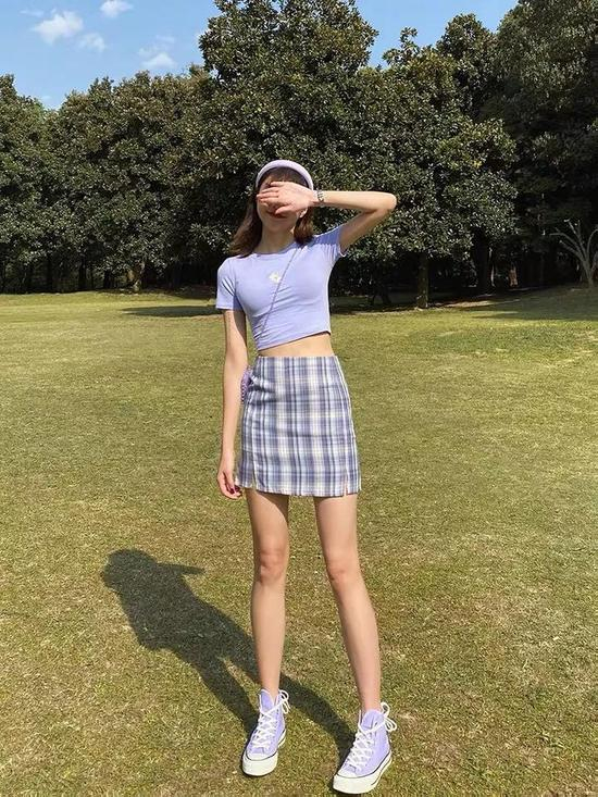 相比烂大街的BM风蓝色套装,可乐更推荐右边香芋紫这套,超高腰的短裙设计巨显身材比例!