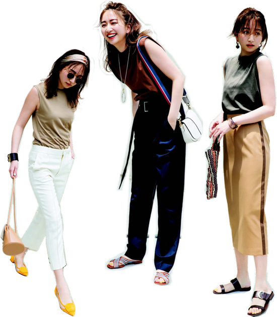 (中)帅气的捏褶长裤,无袖T恤塞进长裤里穿着。好像晒褪色的棕色很有夏天气息。