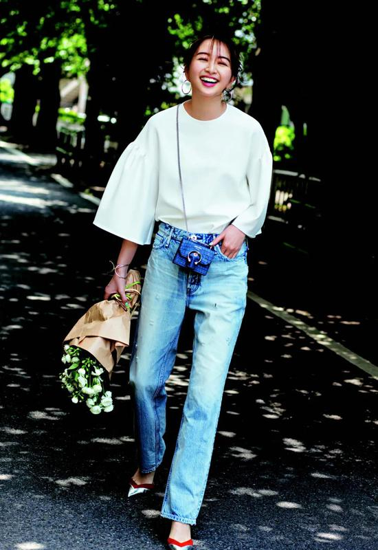 要想华美女人味上衣穿出摩登感,用时髦休闲牛仔裤搭配是关键。迷你斜挎包或者高跟鞋等增添活泼感。