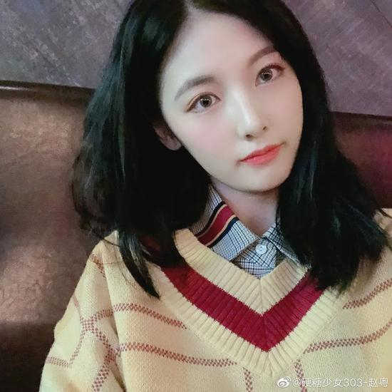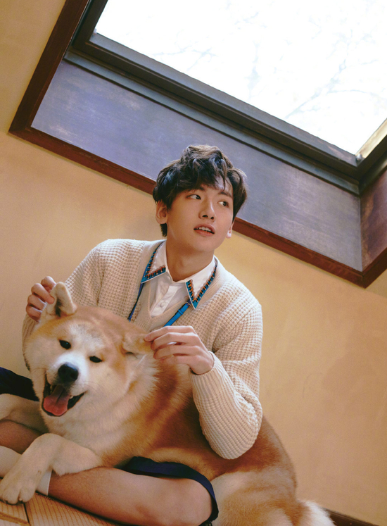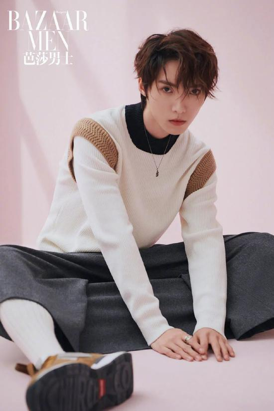 身着白色圆领毛衣的赵磊与粉色系背景完美契合,领口与衣袖处的拼接设计打破沉闷,与下装颜色相呼应,于整体而言简单又不失活力。