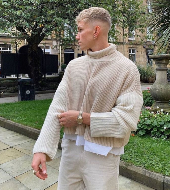 小个子的朋友们看这里,建议选择短款高领毛衣,又或是将下摆塞进裤子来提高腰线,以起到拉长腿部线条的作用。