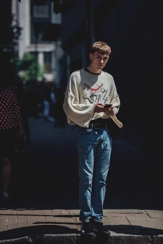 如果觉得纯色过于单调的话,可以选择带有印花图案的毛衣来为你的造型增添些许亮点,或者使用叠穿法则来提升整体的层次感。由于上衣已经足够吸睛,所以下装应尽量选择简单的款式,来营造“上繁下简”的反差感,使整套搭配变得舒适耐看。