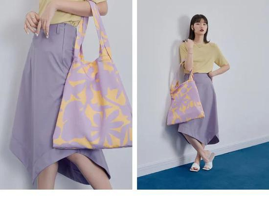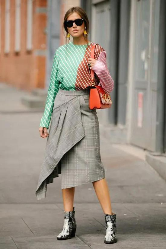 除了撞色,也可以通过同色系或者同图案的拼接,营造出不对称的设计风格,这样的话也更百搭实穿,没有过亮的颜色那么抢眼,看上去也非常和谐统一。