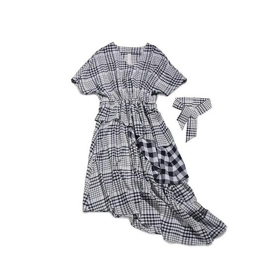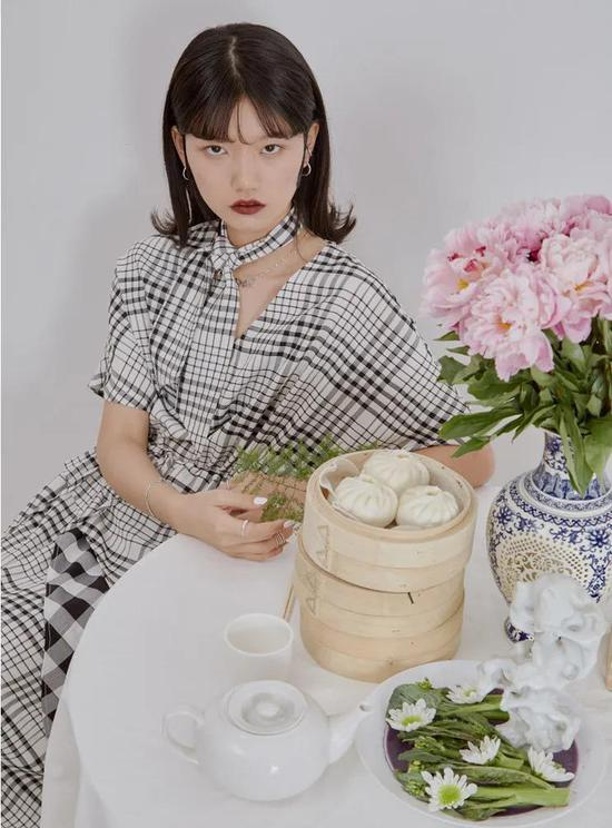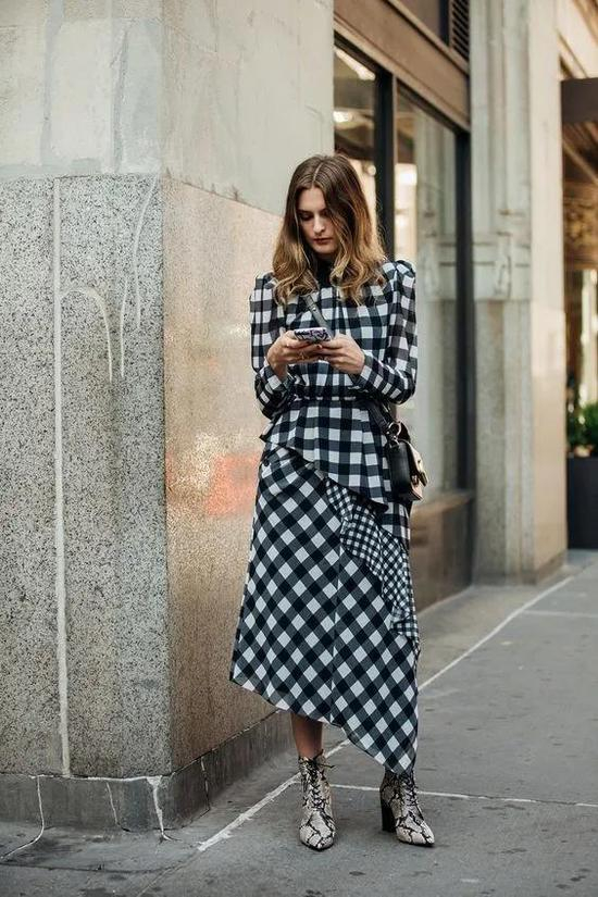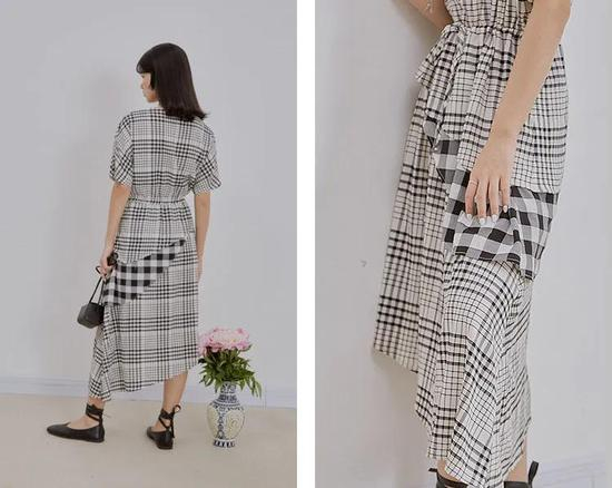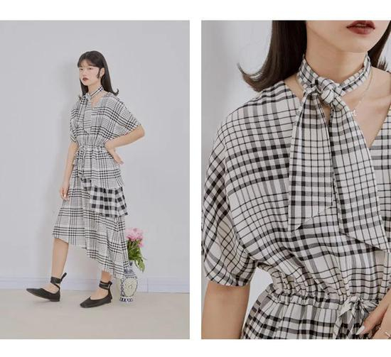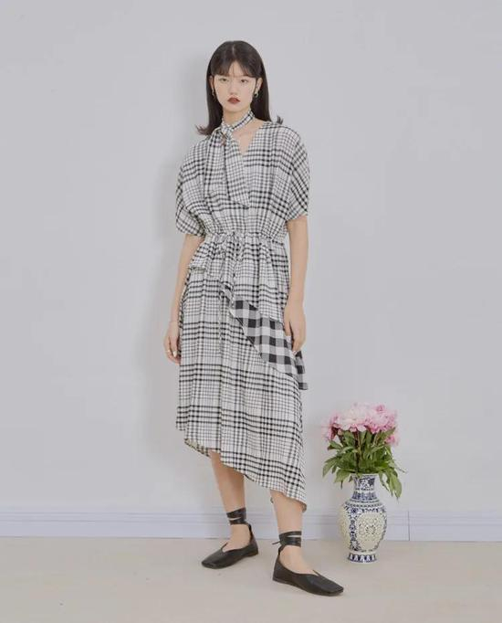 有耳的格纹连衣裙做了粗细两种格纹之间的拼接设计,黑白格纹经典时髦也不挑人,加上不对称的层叠下摆,灵动又飘逸,吸睛度一百分。