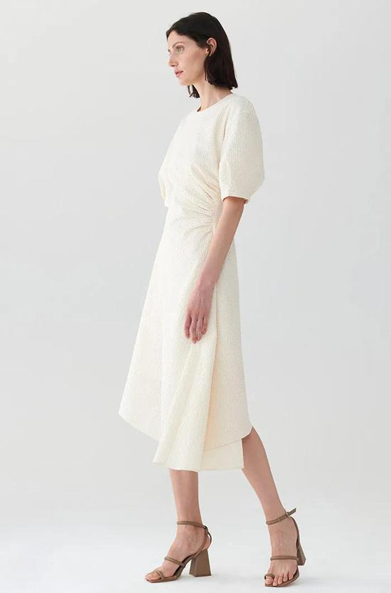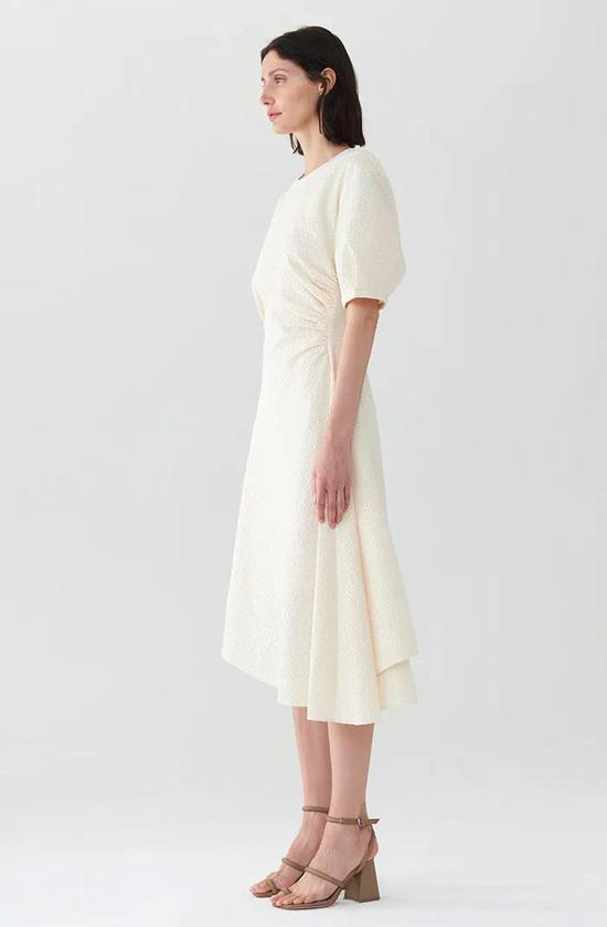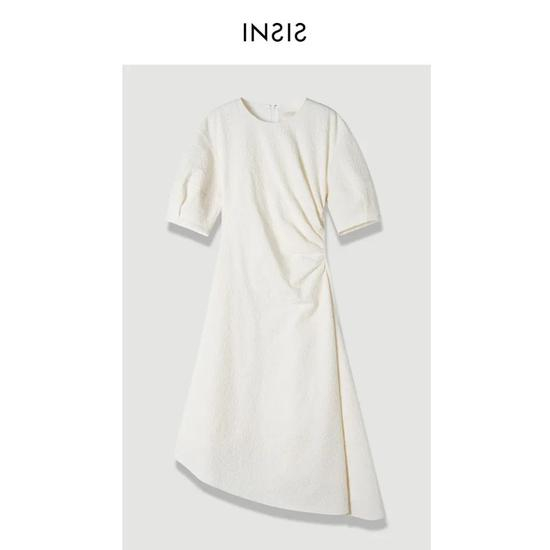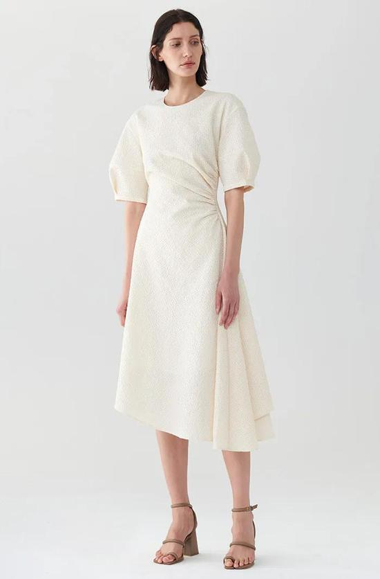 这条连衣裙亮点在于腰部做了立体剪裁手工捏褶工艺,设计感十足,修饰腰身、展现女性腰部曲线。再加上不对称的裙摆设计,在左侧增加了裙摆量,摆动时彰显优雅大气。