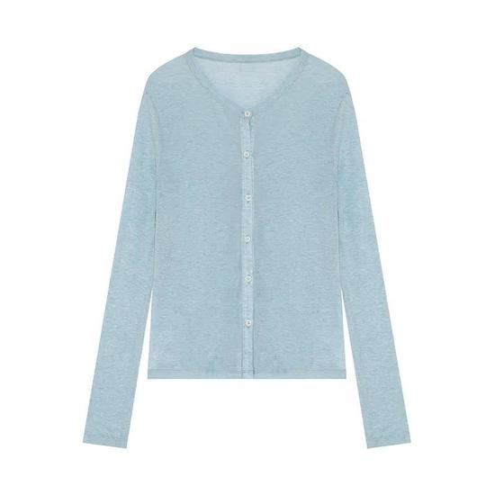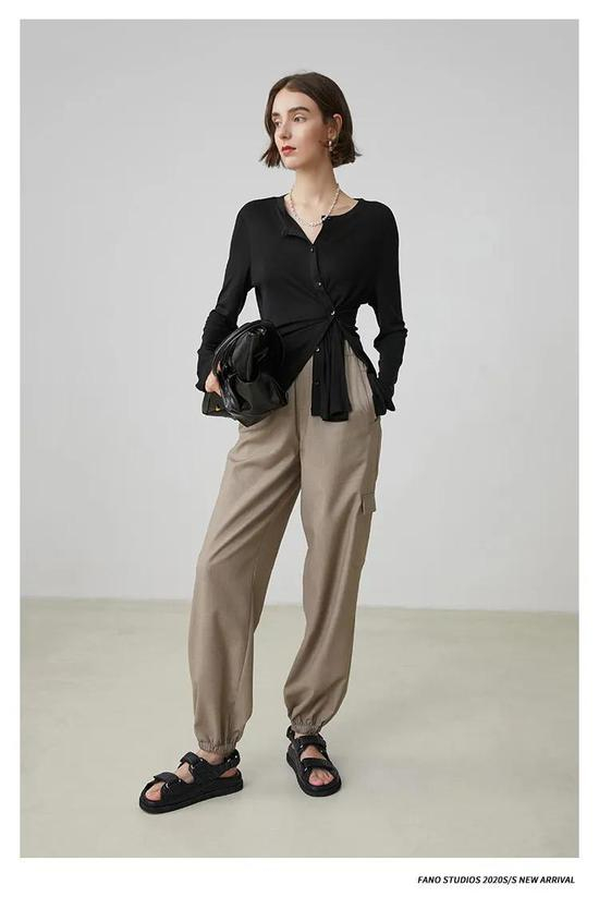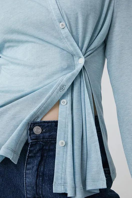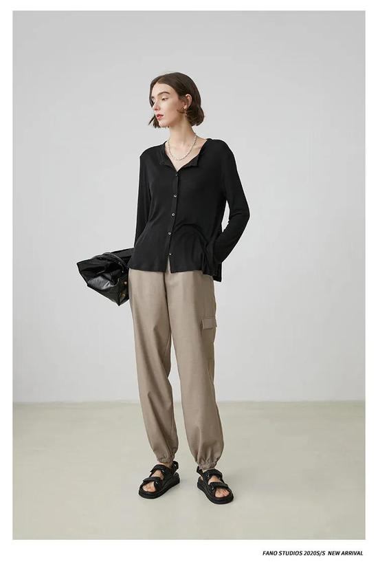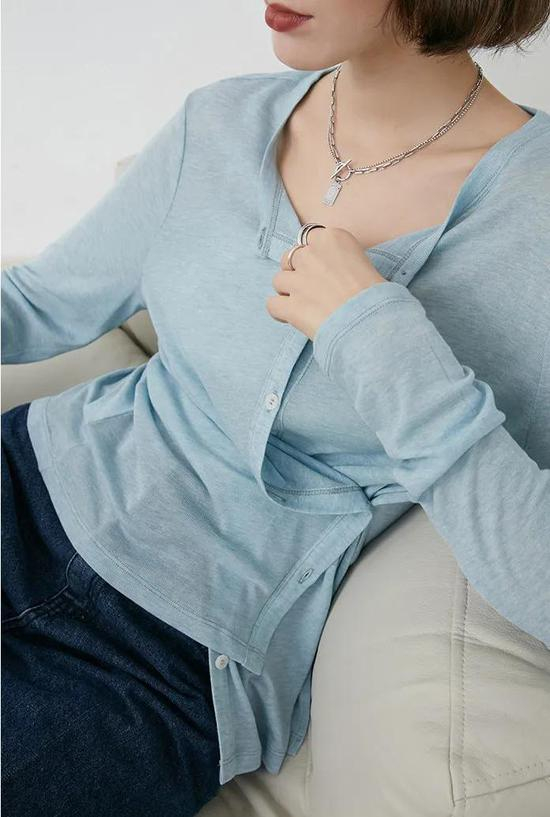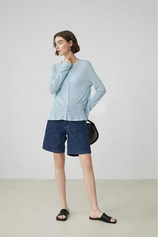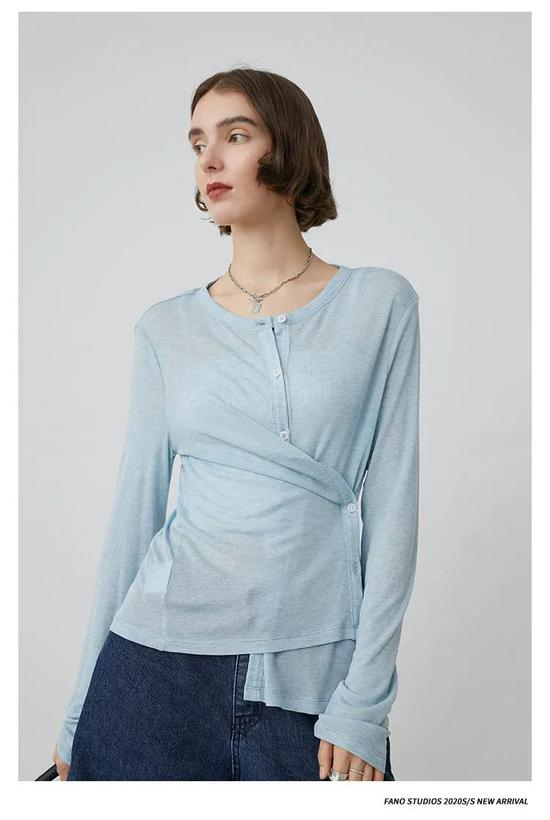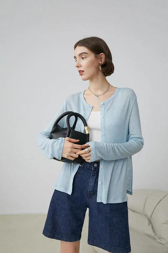 普通的薄针织开衫未免太中规中矩,这件衣服特别之处就在于侧边部位加了一颗小纽扣,侧扣穿法营造不规则造型感。
