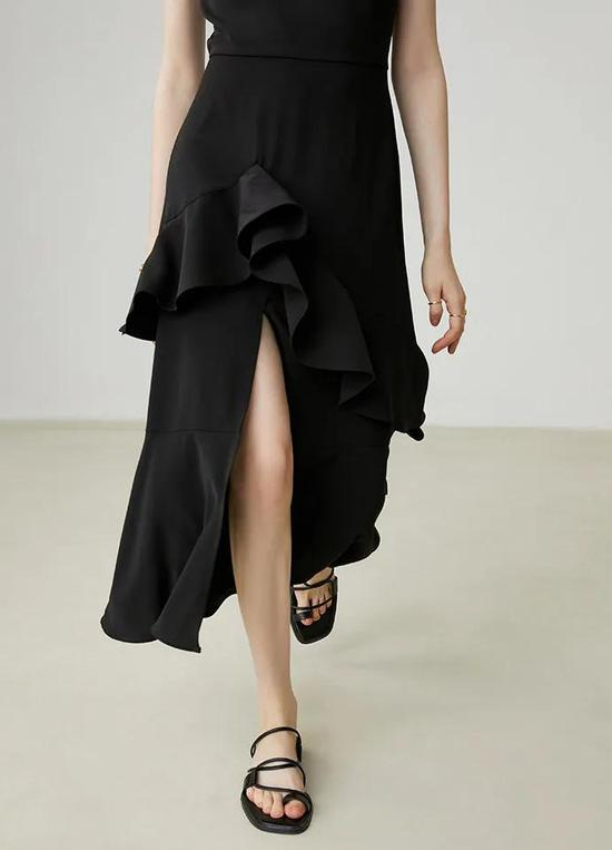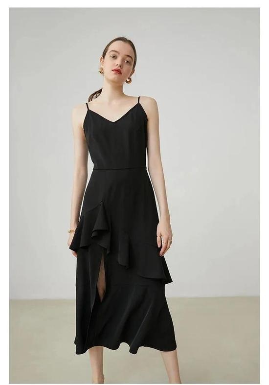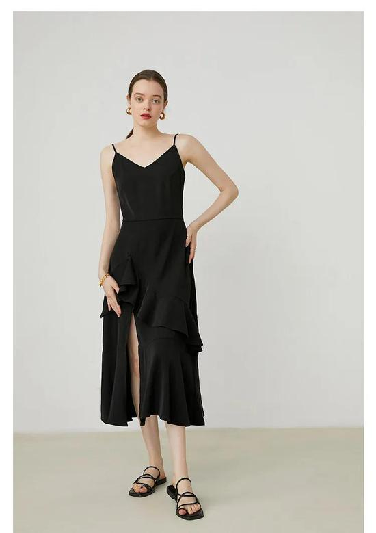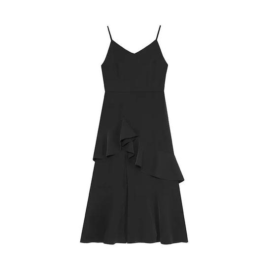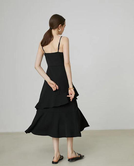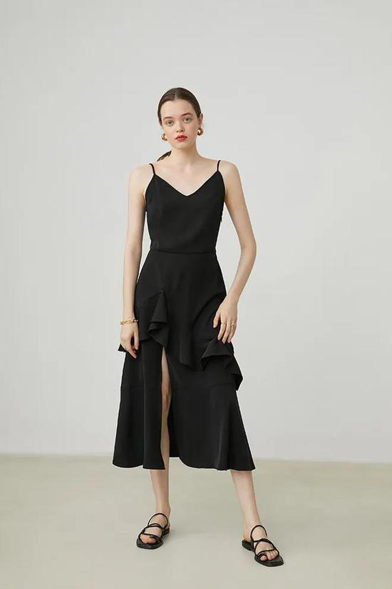 这条黑色吊带连衣裙不同于普通款式,飞扬的裙摆加上不规则荷叶边装饰,层次分明,极简的剪裁便能刻画出女性特有的线条。