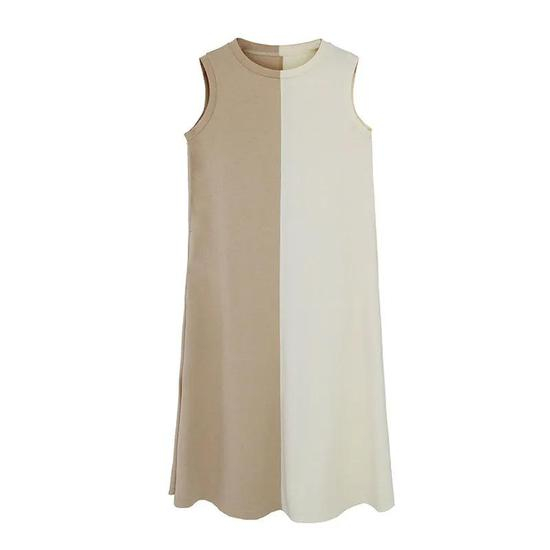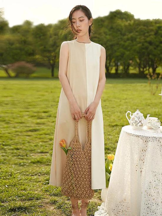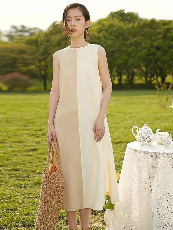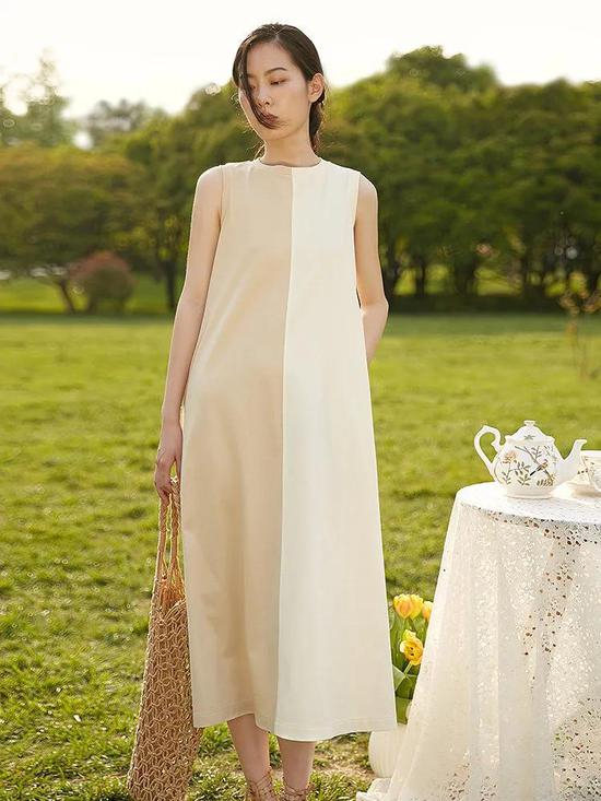 我找了一条颜值和气质都在线的连衣裙,这条的米色和杏色拼接都是很显气质的配色,自然实穿,还可以消解单调。