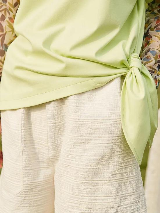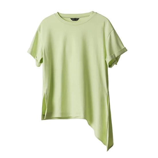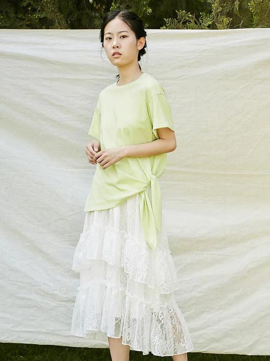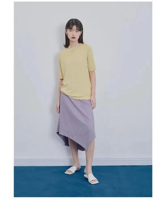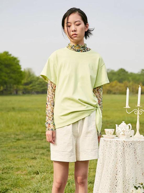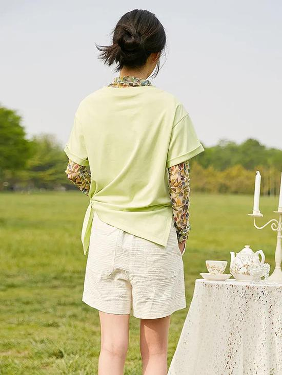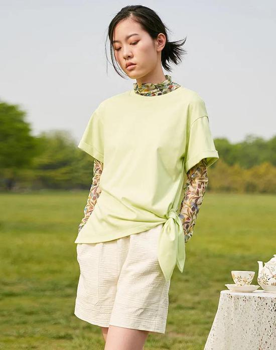 逸侣ile这件T恤就简单许多,下摆侧边有个打结的不对称设计,休闲感中又有细节造型感,搭配起来毫无压力。无论是裙装还是短裤、牛仔裤,都能很好地驾驭。