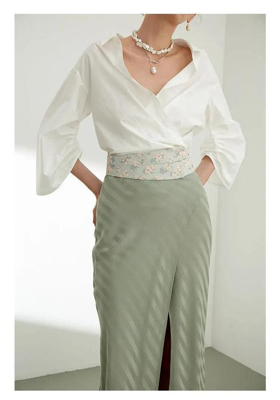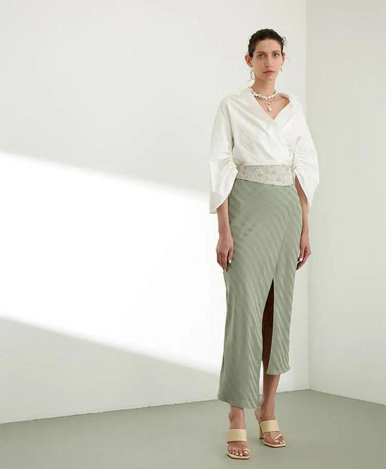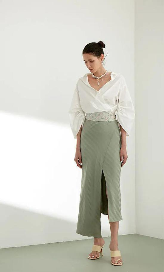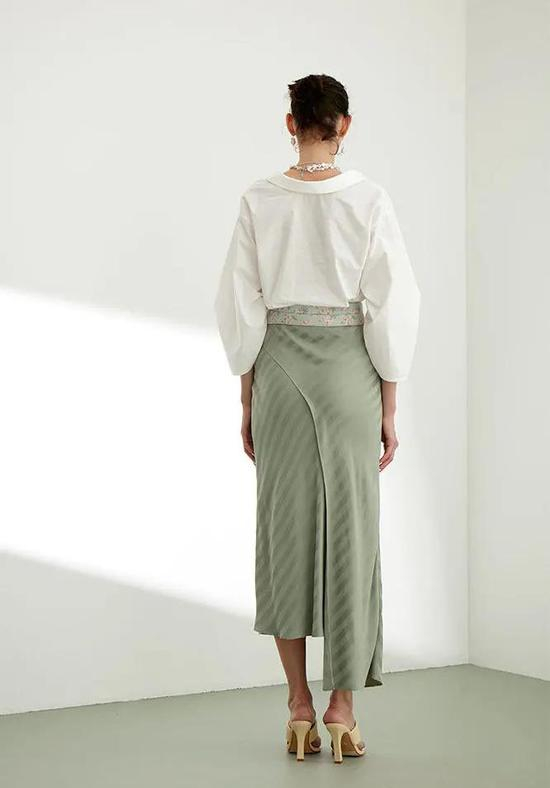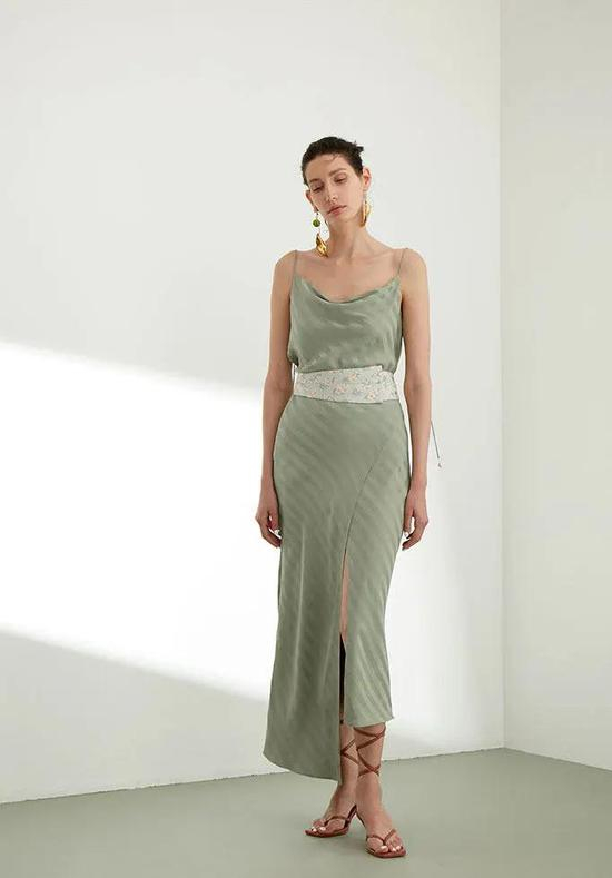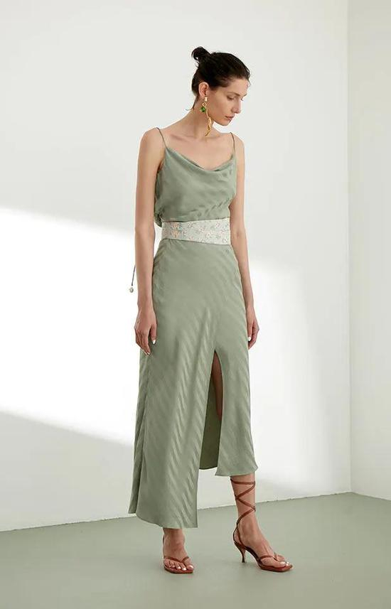 仔细看裙子上有亮色和哑光交织的双色条纹,灰绿色也非常显气质,搭配同色系的上衣就清清爽爽,很应景夏天。