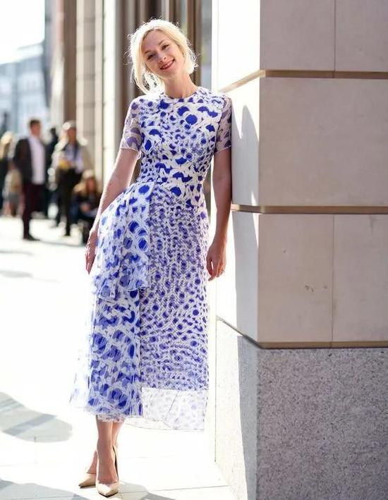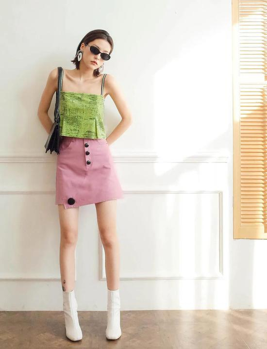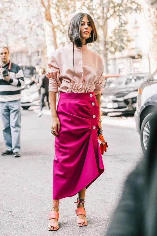 还有一种表现方法是纽扣装订的不对称衣裙,本身纽扣就是很时髦的小元素,很起到很时髦的点缀作用。作为不对称半裙的装点,就更加有个性了。
