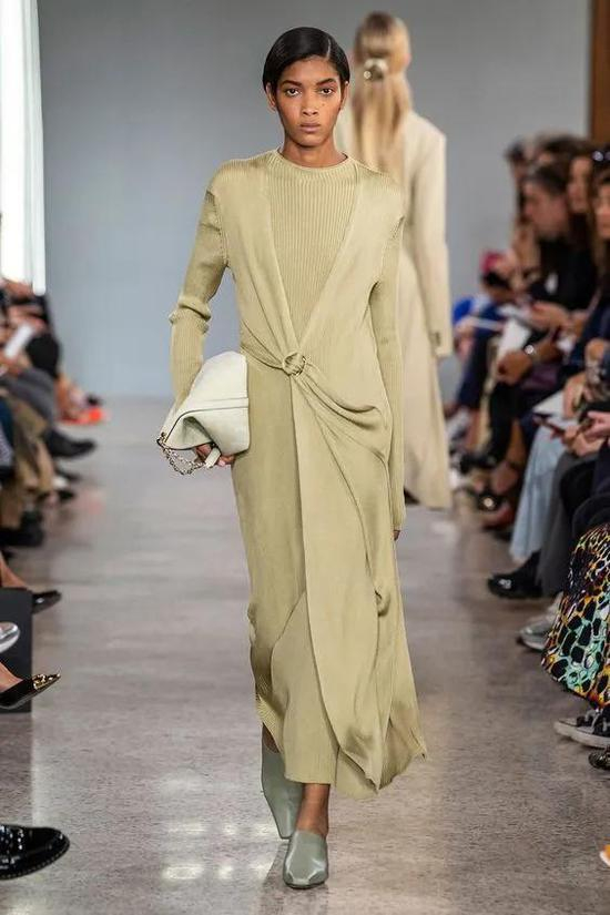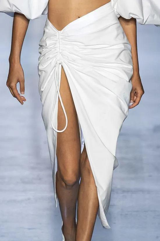 其中抽褶的长裙最为常见,裙边拉扯为一长一短,轻松修饰小腿,不得不说时装周上这个单品的出镜率非常高。