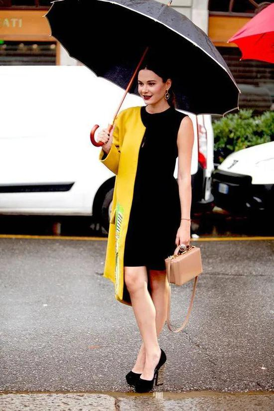 不对称的撞色、特别是大范围那种,给整套look增加了几分有趣玩味,使一件平淡无奇的单品变成了全身的点睛之笔,即使是低调的全身大面积黑色,也不会无聊。