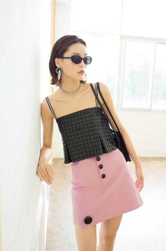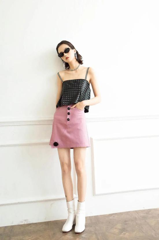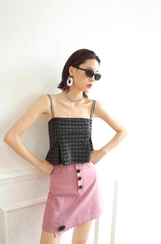 黑扣子除了做一个不对称的装饰用,还能很好地平衡粉色的甜腻感。
