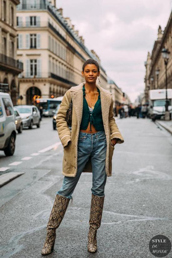 除了卡其色调的蛇纹,更贴近秋冬大地色的感觉,还有更cool的灰白色经典蛇纹。如果你想要做个酷女孩,蛇纹高跟靴一定能满足。随意的牛仔裤,敞开的大衣,偶尔几个金属配饰,看上去就是随性洒脱的girl。记得,内搭最好也有一点露肤,如果是开衫,解开几颗扣子就好~