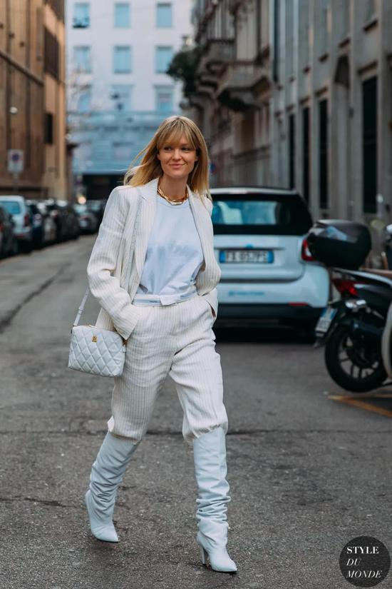 纯色靴当然是鞋柜里的must have,哪个女孩的家里没几双基础的纯色靴呢。不过与往常不同的是,今年直筒、堆堆筒才更时髦。像这样all white的搭配就十分适合冬季,在黑压压的人群中一下就能脱颖而出,但怕冷的女孩们最好还是搭一件同色外套哦~