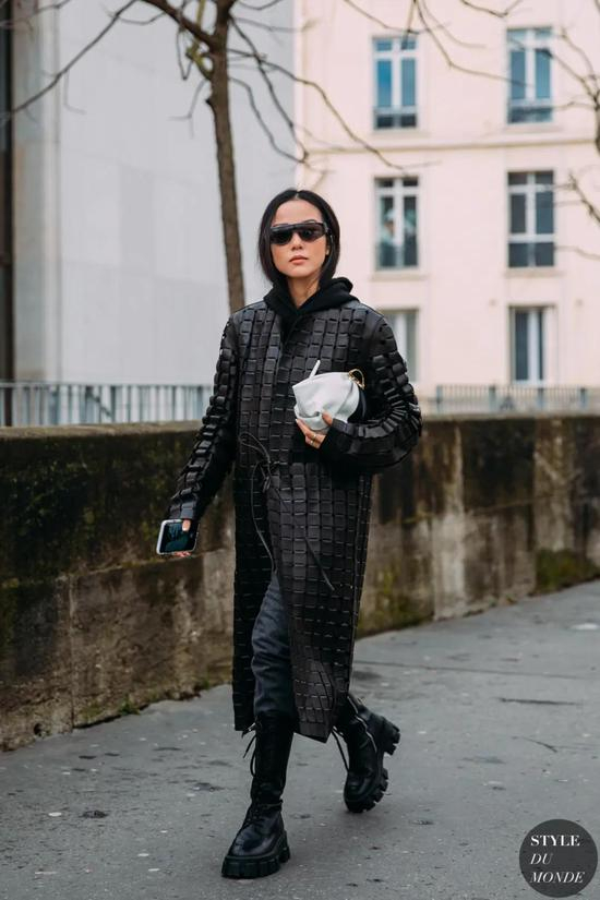 如果你对自己的腿型够自信,可一定要试试薄丝袜+马丁靴,似乎提到丝袜总会觉得容易显得链接,像street girl,但配马丁靴完全不会!反而更酷,上装再穿上厚实的外套,打造上宽下窄的效果,还能更显腿细呢~