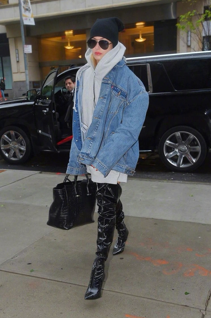 以性感著称的黑色尖头过膝靴,又有了自己全新的展示,宽松长卫衣搭配超大牛仔上衣,看似随意不符合常规的穿搭,却又释放出独特的街头魅力。