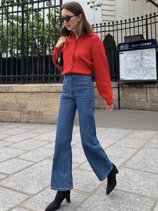 想要整体look看起来更复古的话,可以像小可爱一样搭条深蓝色牛仔裤。