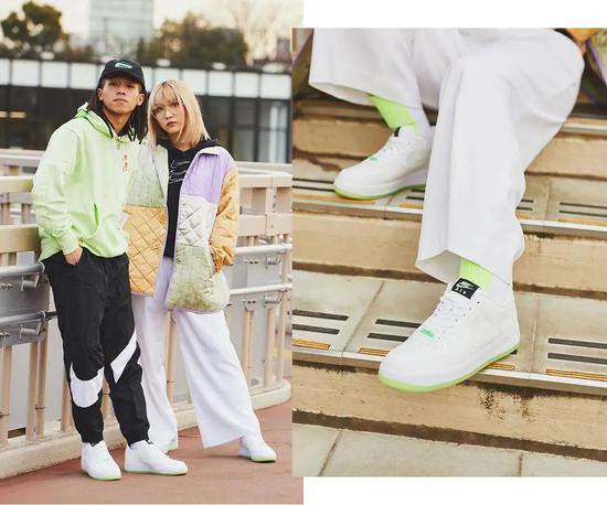 纯白色皮革鞋身打造,swoosh和水晶鞋底处均拼接了荧光绿夜光材质,也太帅气了吧!