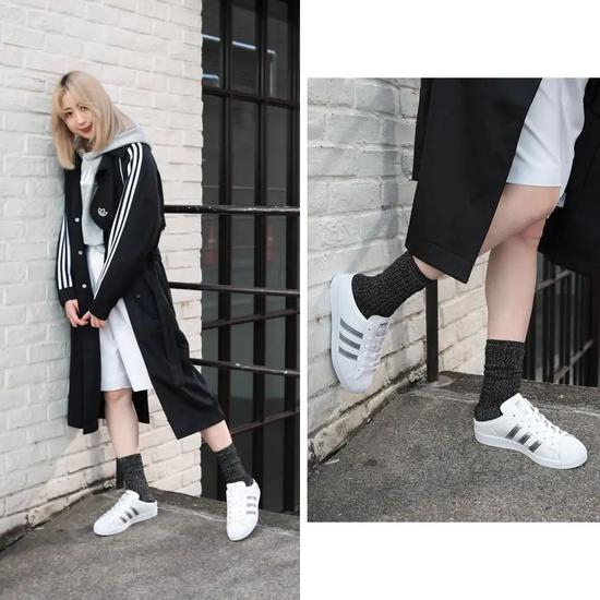 简单的黑白配Superstar为蓝本,但鞋舌鞋尾处均也加入了烫金元素,时尚质感瞬间提升了一个level!