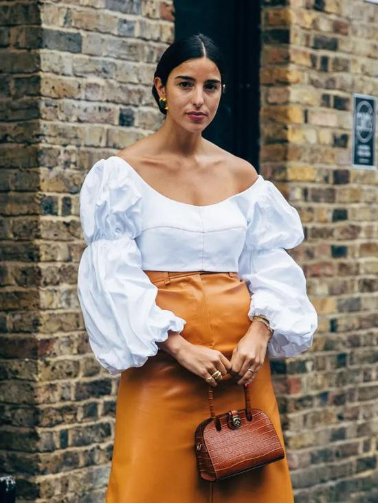 秘密就在于方领设计结合褶皱和夸张的袖子,修饰了手臂的同时,还能弱化掉大胸在上身的比例,将视觉重心放在优越的颈部线条和锁骨部分。