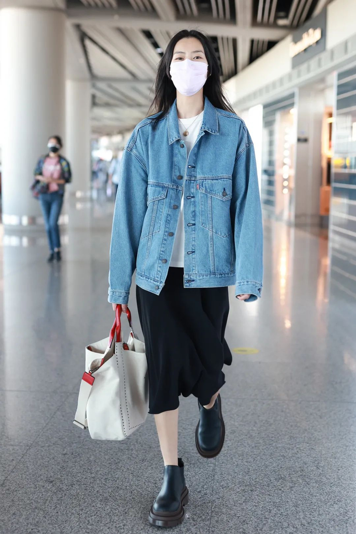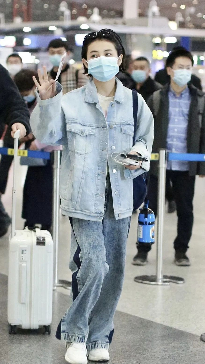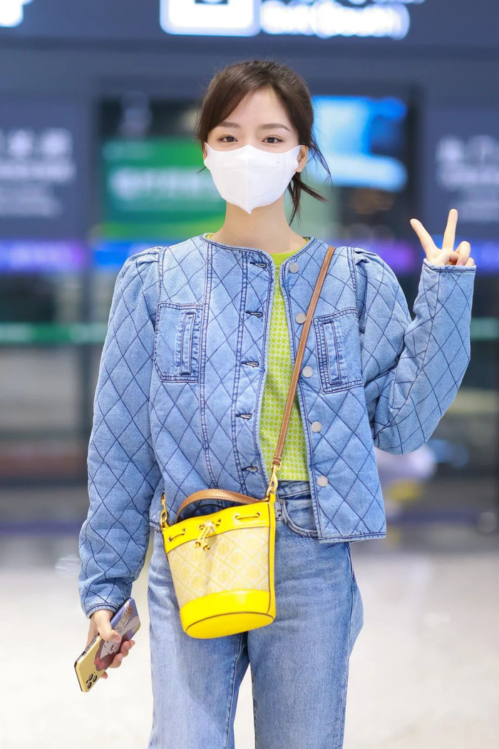 演员任敏也在机场穿搭中选择丹宁风,打扮俏丽地准备出发。