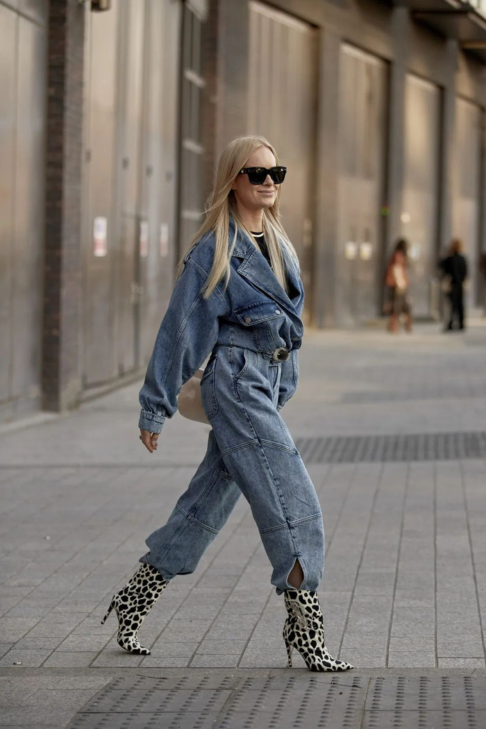 不论是浅色丹宁还是深色丹宁,穿上这样的连体裤根本不用思考鞋履的搭配,随便穿上一款短靴都能为你整套look加分。