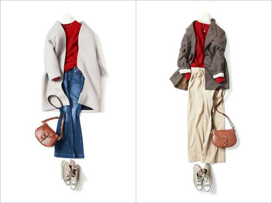 同样都是以红色针织毛衣作为打底,搭配浅色廓形大衣和蓝色牛仔裤,这身穿搭知性大气。