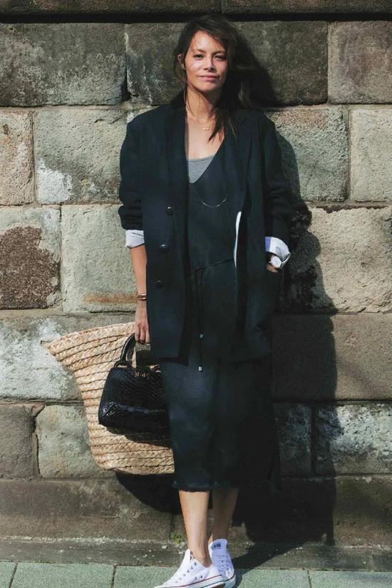 灰色打底搭配墨蓝色长裙、再叠穿黑色西装,“三层叠穿”LOOK时髦兼具层次感。