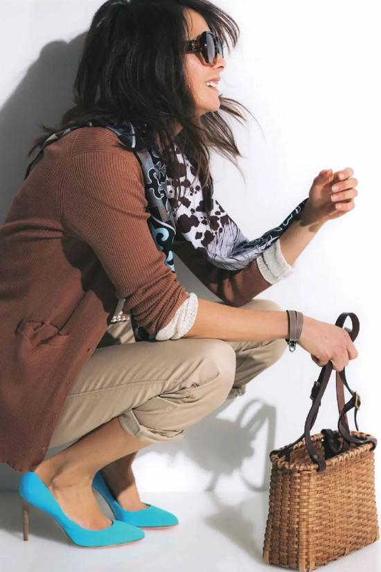 在菊池京子的搭配展示中,一双蓝色高跟鞋分外醒目,也彻底打破了原来深色穿搭的沉闷感。