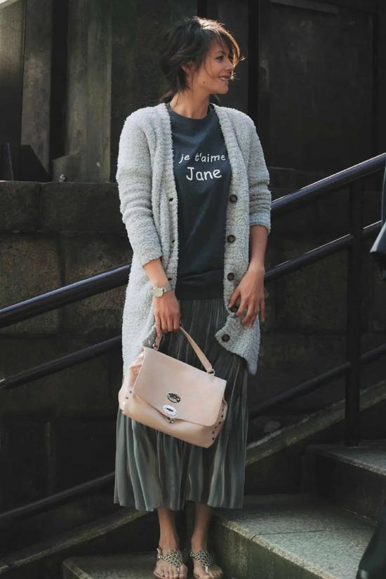 日常外出时的菊池京子一身穿扮自然舒适,套头衫+百褶半身裙+长款针织开衫,简单的单品、简单的配色,组合在一起便格外有时尚的味道了。