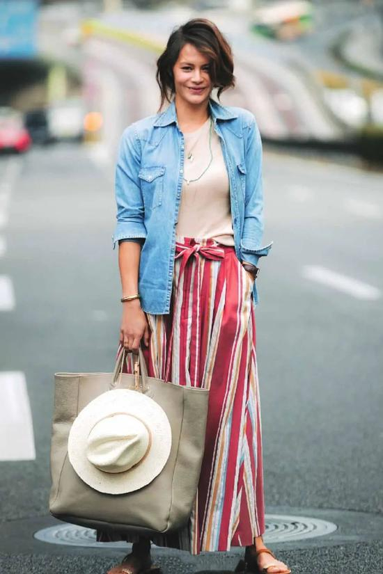 下身穿的红色条纹长裙自带吸睛力,也给整套LOOK注入了不少新鲜感。
