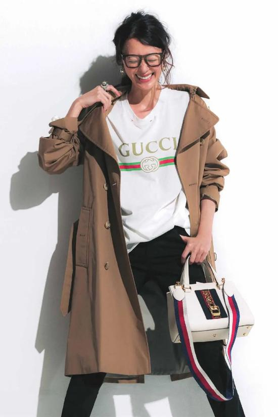 经典百搭的Gucci白T恤+简洁小黑裤,再外搭一件深卡其色长款风衣,这一身穿扮虽然看着简简单单,却叫人倍感舒服呢!