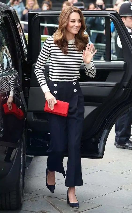 水手裤(sailor pants)最早是为水手设计的,宽大的裤腿能让水手们在擦甲板时可以方便卷起来。双排扣的设计最开始是为了方便水手跳入海中时,能一下子脱掉裤子。后来腹部两排扣的设计在时装领域成为水手裤的最大特点,别小看这几枚小小的纽扣,它让腰臀部曲线更完美。