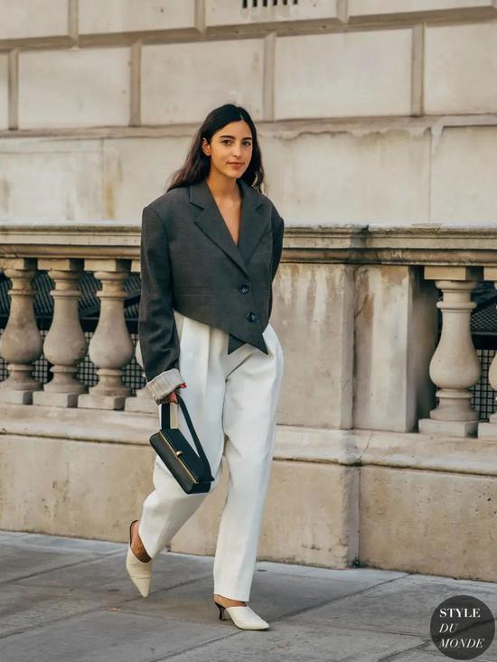 或者用深灰色西装搭配白色阔腿裤也很有型。总之黑白灰这三种颜色混搭起来基本不会出错。