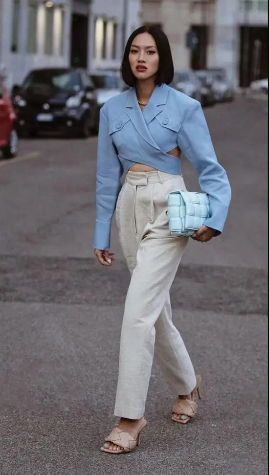 很多时装博主对这些短款西装爱不释手,例如时尚博主Marta Cygan,就很爱穿短西装,下面搭配高腰牛仔裤、印花裤,或者里面搭配非常亮色的Top来彰显自己的搭配功底。