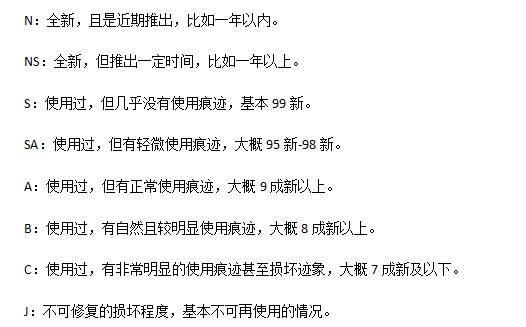 部分商家还会用一些英文字母来标识级别,这个是日本中古商会的中古包成色参考,具体对应如下: