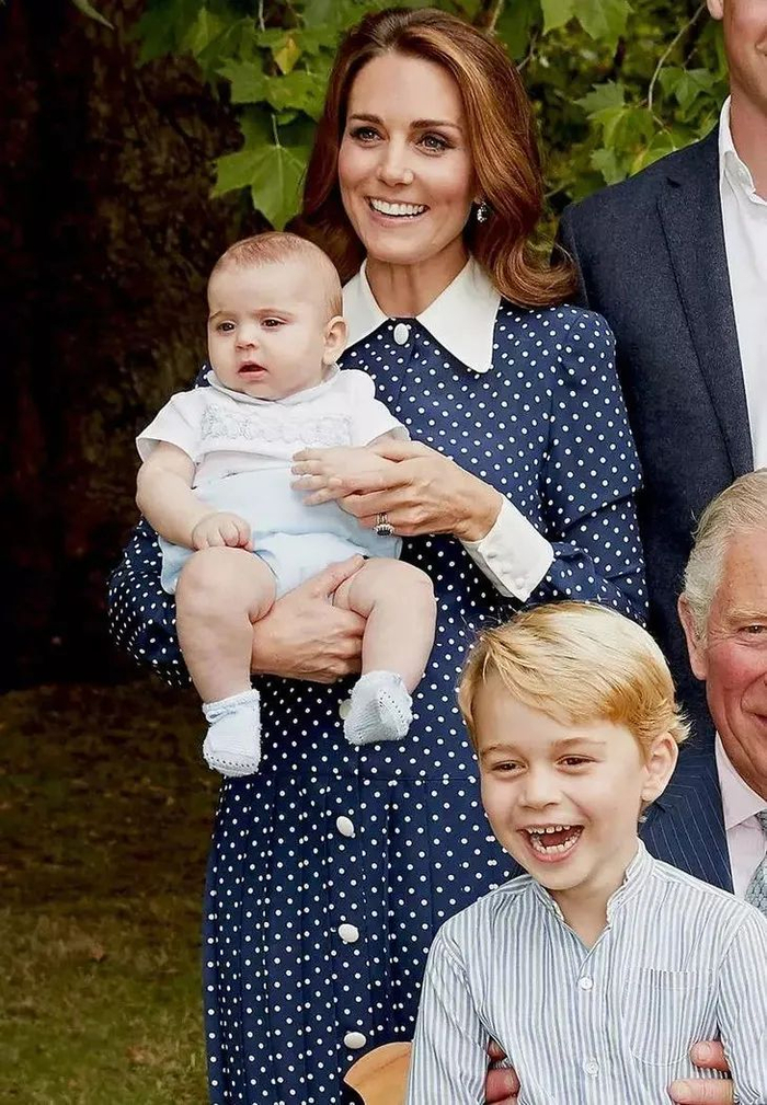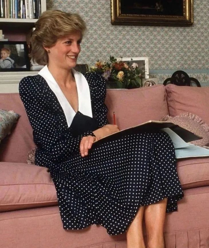 早在2018年,凯特王妃就穿着Alessandra Rich波点连衣裙出镜查尔斯70岁生日大合照,这条深蓝色波点裙也和戴妃曾经另一条白色小翻领连衣裙有异曲同工之妙。