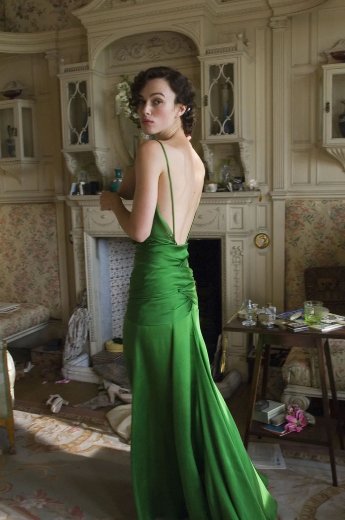 被运用在电影角色中,被我们大众所记忆与熟知,就如同电影《赎罪》中的女主角Keira Knightley那一袭美得窒息的露背果绿缎面长裙,“英伦玫瑰”含蓄绽放。