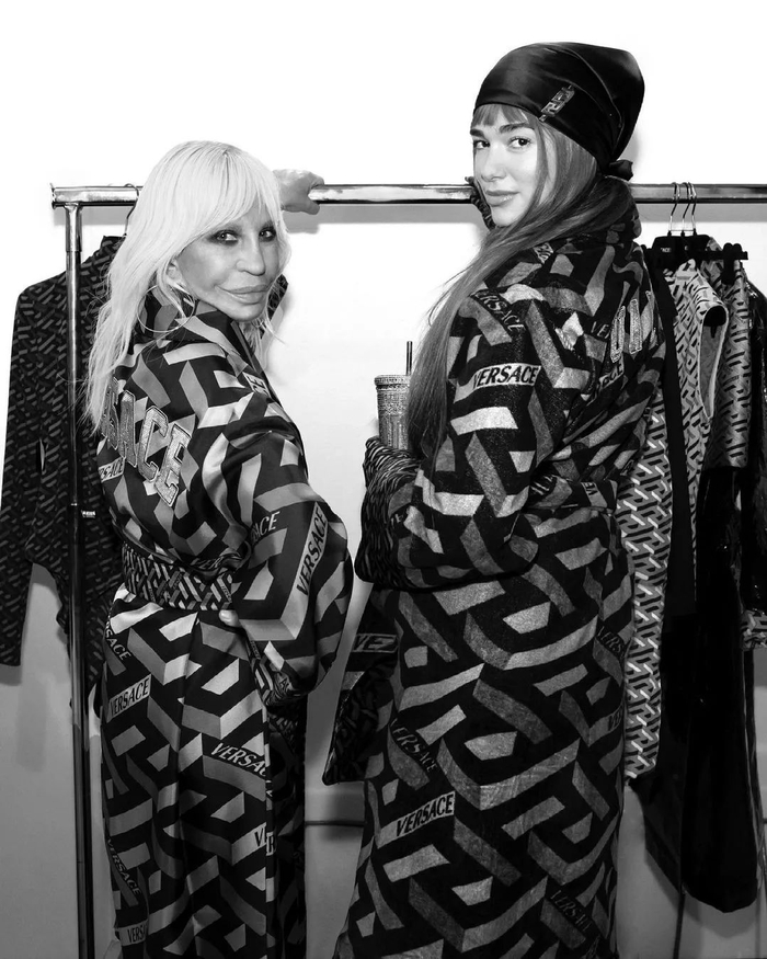 Versace创意总监Donatella Versace在IG上宣布Dua Lipa成为品牌2021秋冬的灵感缪斯,在系列大片中啪姐与品牌全新印花图案’La Greca’一同亮相。