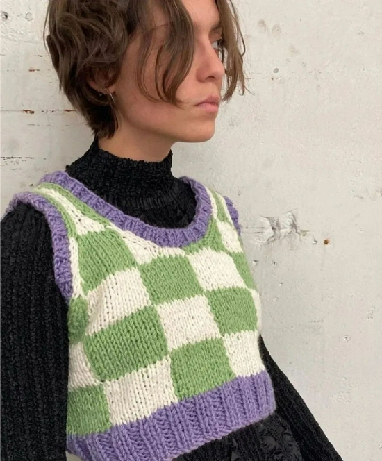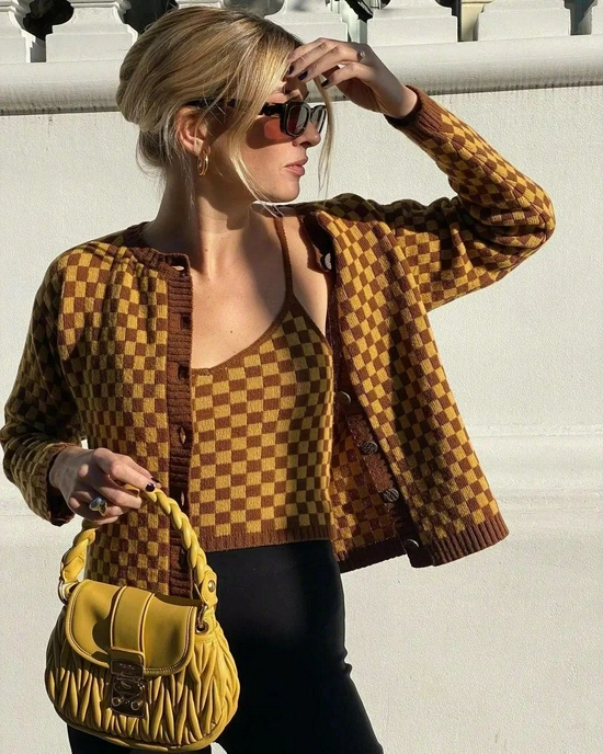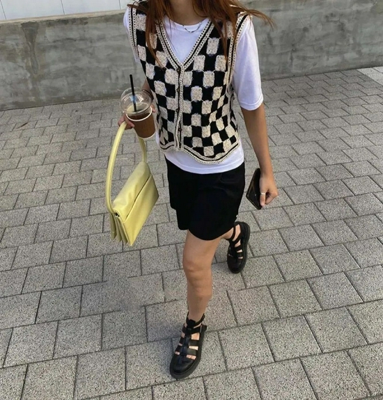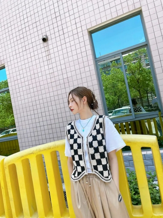 立秋了COCO建议人手一件的大表姐style棋盘格针织马甲,等天气凉点,把内搭换成长袖打底,直接穿到秋冬,一份钱收获两个季度的美好!