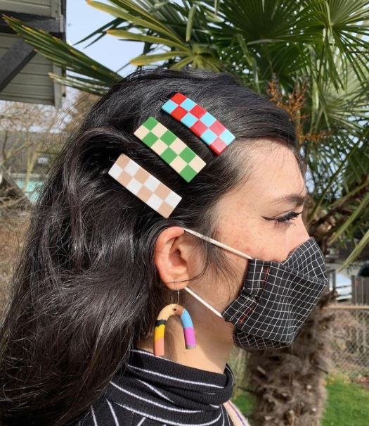 小夹子也是打造发型的重头戏,不光可以别在头上,棋盘格发卡也可以别在衣服包包上,是时髦女孩的必选配饰。
