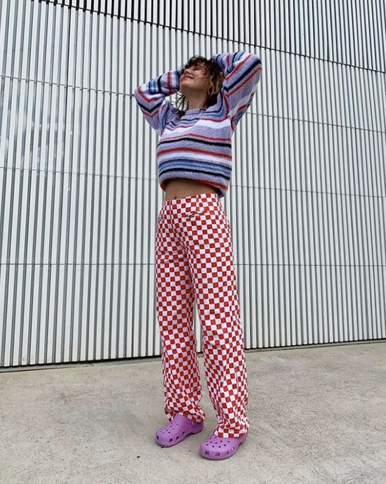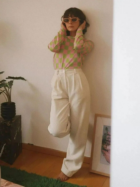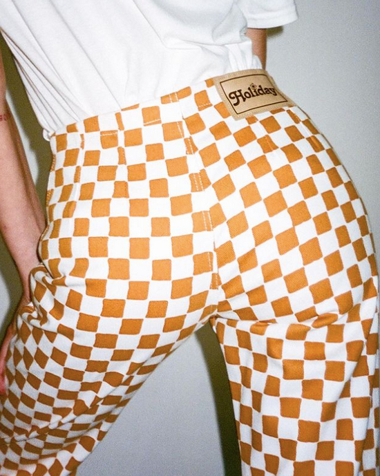 虽然阔腿裤的线条很利落有点干练,但遇上棋盘格就有别样的感受,搭吊带很容易穿出辣妹风~彩色系的棋盘格就适合作为进阶,会穿的女生经常选择撞色搭配,轻松营造休闲慵懒氛围。